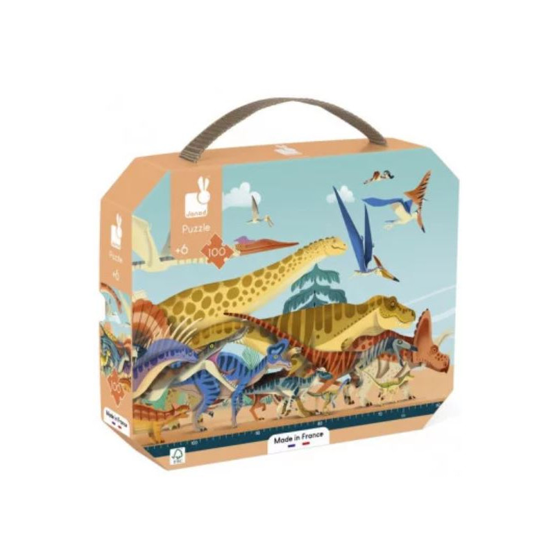 Découvrez le puzzle panoramique Dino de Janod, un magnifique puzzle de 100 pièces en carton pour les enfants à partir de 6 ans. Un puzzle fabriqué en France avec une superbe illustration qui vous plonge dans l'univers des dinosaures.