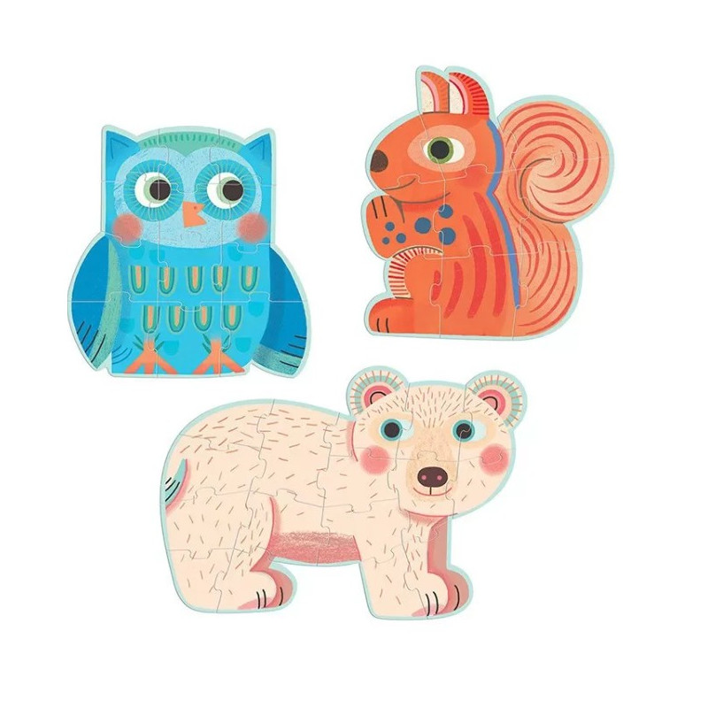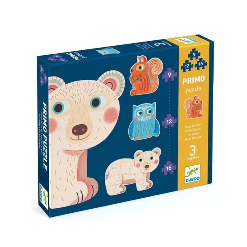 Puzzle Primo – « Dans la forêt » est un coffret qui comprend 3 puzzles évolutifs et silhouettés de difficulté croissante sur le thème des animaux de la forêt. Un hibou de 9 pièces, un écureuil de 12 pièces et un ours de 16 pièces. Ces puzzles sont spécialement conçus pour les plus petits à partir de 3 ans.