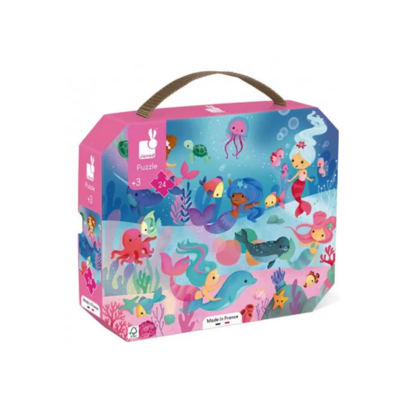 Découvrez le puzzle sirènes de Janod, un magnifique puzzle de 24 pièces en carton à partir de 3 ans. Nagez avec les sirènes et les animaux marins avec ce splendide puzzle fabriqué en France.