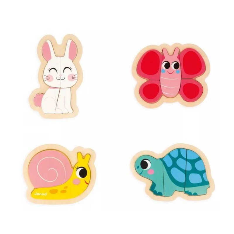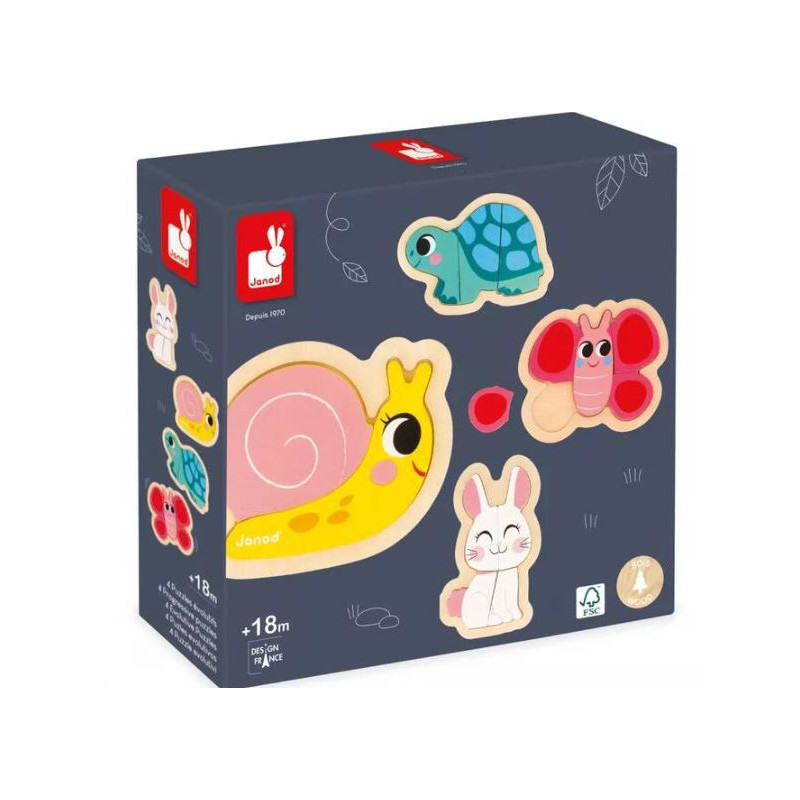 Découvrez le coffret 4 puzzles évolutifs Jardin de Janod sur le thème des animaux du jardin avec : un escargot de 2 pièces, une tortue de 3 pièces, un lapin de 4 pièces, et un papillon de 5 pièces.