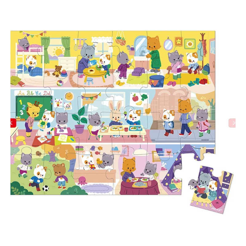 Découvrez le puzzle Une journée de Janod, un joli puzzle de 24 pièces en carton pour les enfants dès 3 ans. Un puzzle fabriqué en France avec une illustration aux couleurs douces reprenant les rituels du quotidien.