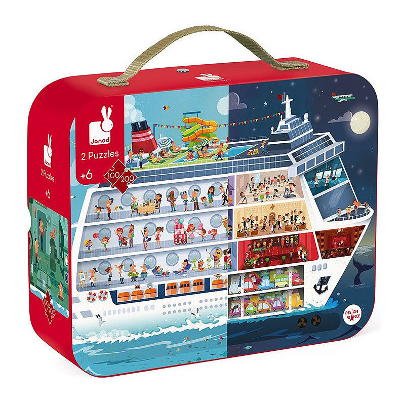 Le grand puzzle (200 pieces) montre la scène du bateau de croisière de nuit et le petit puzzle (100 pieces) le bateau de jour. Modèles inclus. Le tout se range facilement dans une valisette.