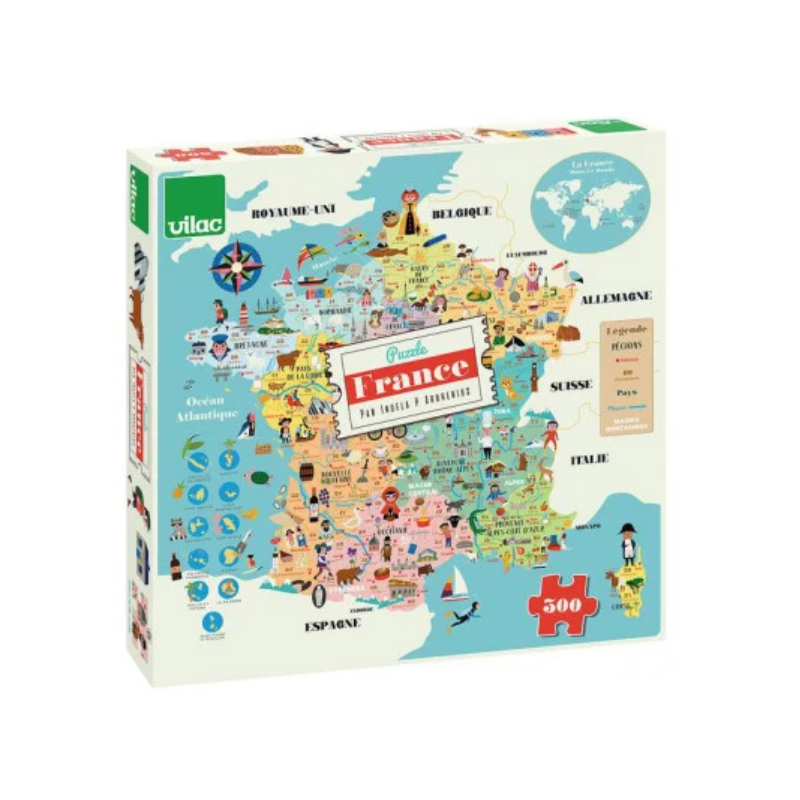 Découvrez le puzzle carte de France de Vilac, un puzzle de 300 pièces en carton illustré par Ingela P. Arrhenius.