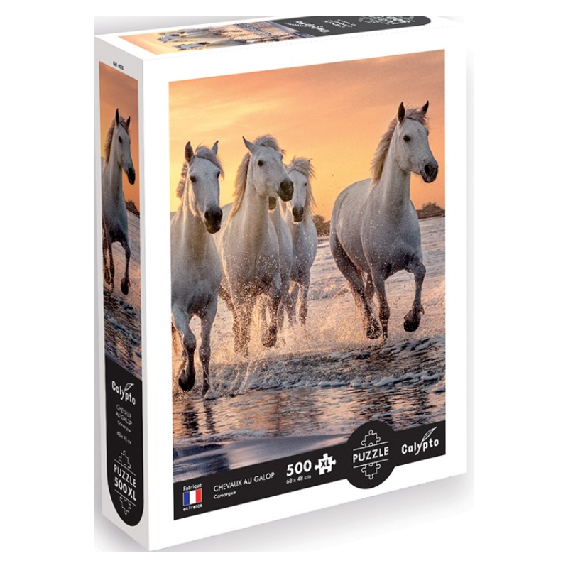 Ce puzzle représentant de magnifiques chevaux en camargue de Sentosphère est composé de 500 pièces au format XL de 2.7 x 2.5 cm. toutes différentes avec un toucher "soft-touch".