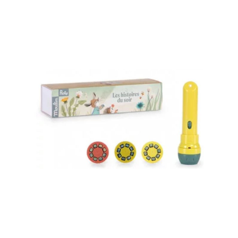 Découvrez la lampe à histoires de la collection Trois Petits Lapins de Moulin Roty, une lampe torche qui projette des images en couleurs pour raconter de jolies histoires à votre enfant.