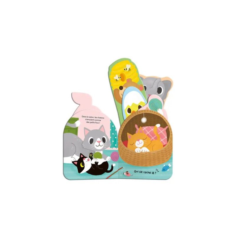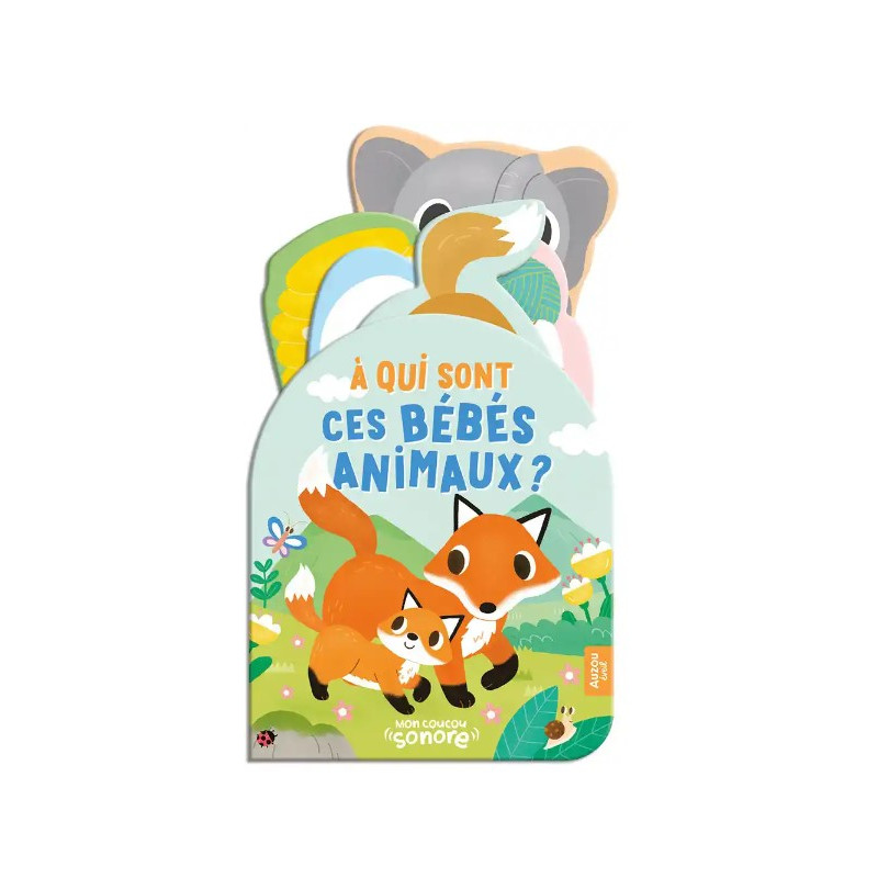 Voici le livre à qui sont ces bébés Animaux? de Auzou : Les bébés animaux jouent à cache-cache… Tire sur les éléments qui dépassent et écoute les sons pour découvrir qui se cache à chaque page.