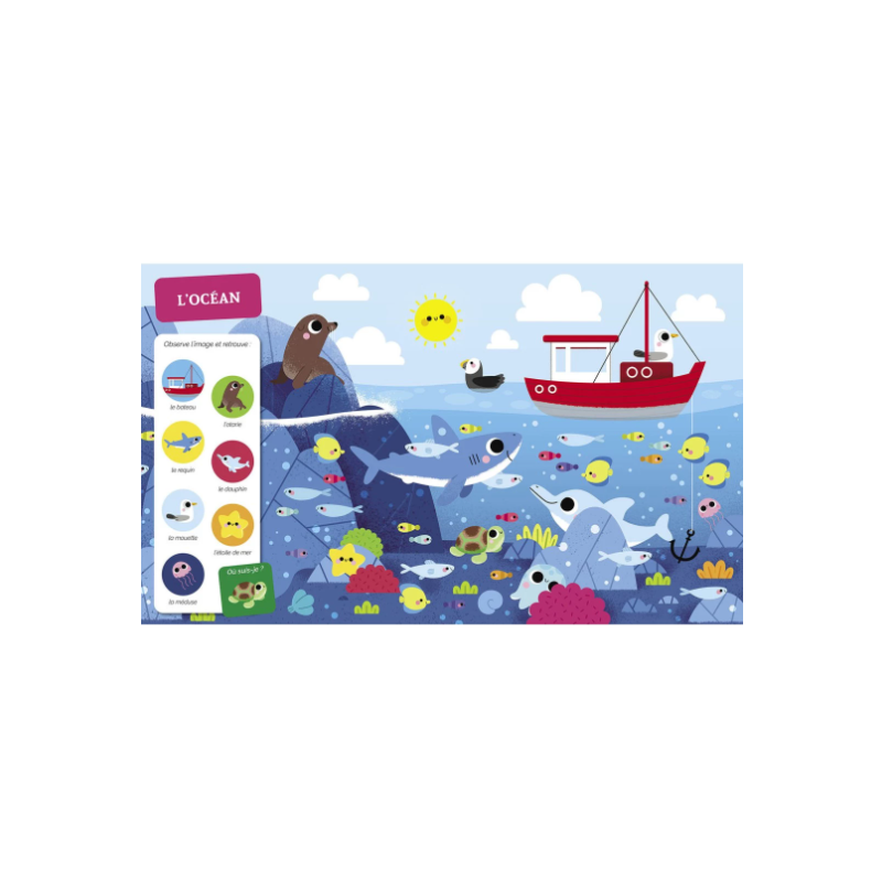 Un livre cherche et trouve à emporter partout pour jouer seul ou à plusieurs! 9 illustrations aux couleurs vives représentant des animaux et des objets sur le thème de l'eau, que votre enfant devra retrouver. Un livre éducatif qui permet aux enfants de développer leur sens de l'observation et leur vocabulaire dès le plus jeune âge.