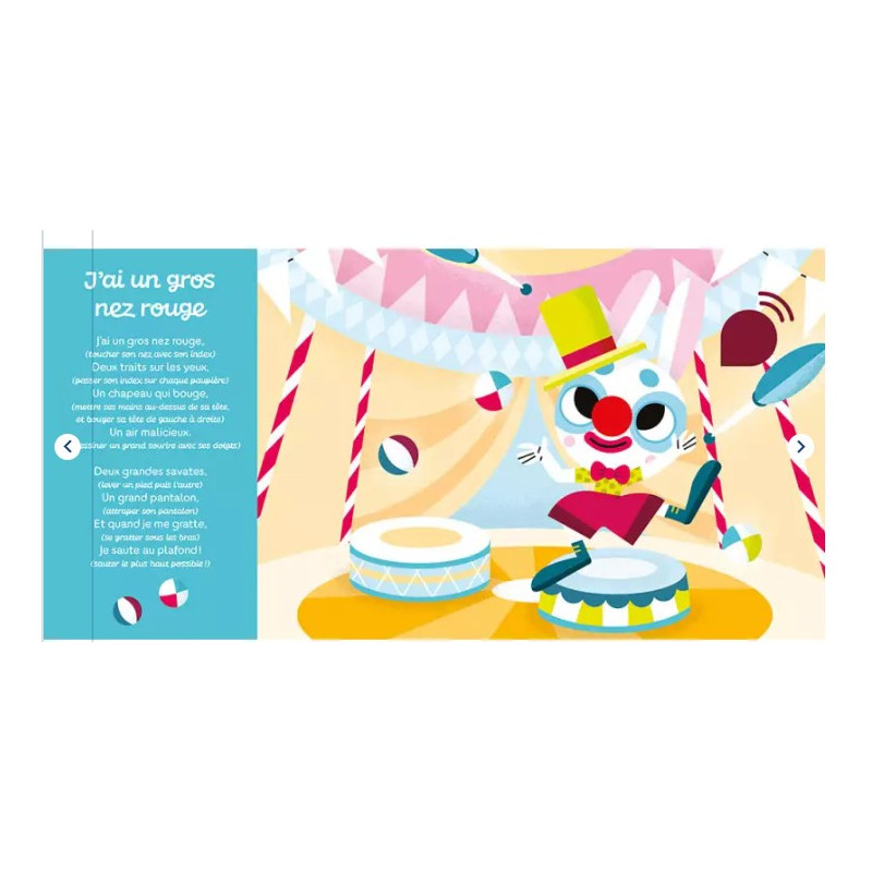 Un livre musical à mettre entre les mains des enfants en toute autonomie ou à partager joyeusement. En appuyant sur les puces sonores, votre enfant pourra écouter "Ainsi font, font, font", "Jean Petit qui danse", "Savez-vous planter les choux?", "J'ai un gros nez rouge,", "Un petit pouce qui danse" et "C'est la baleine".