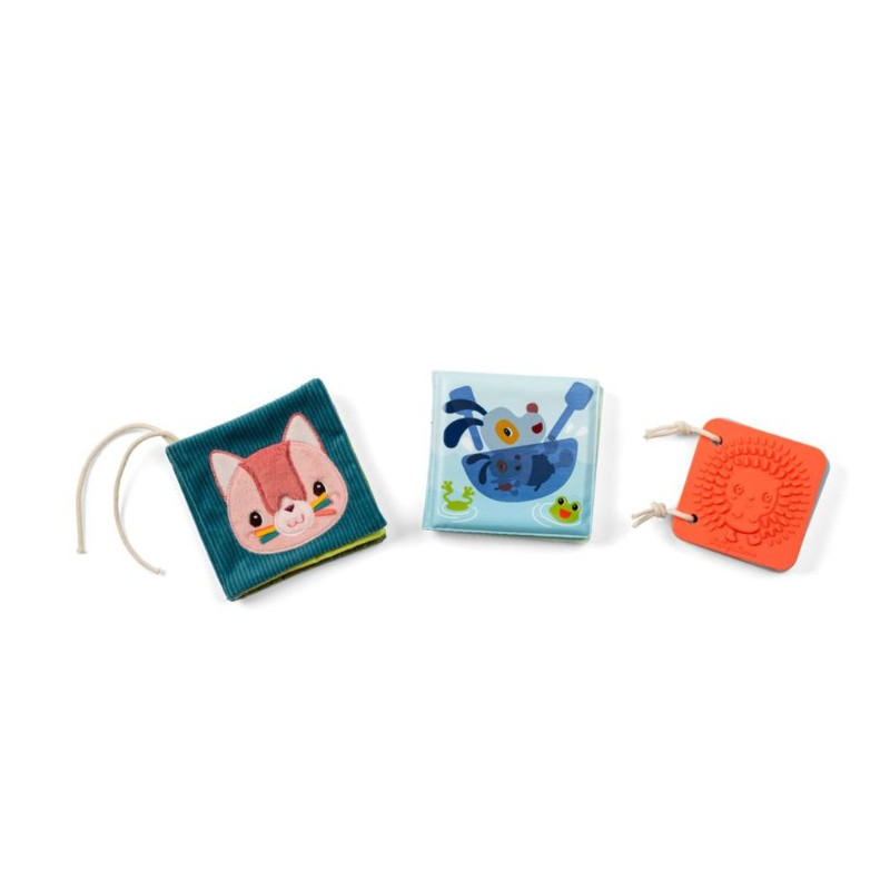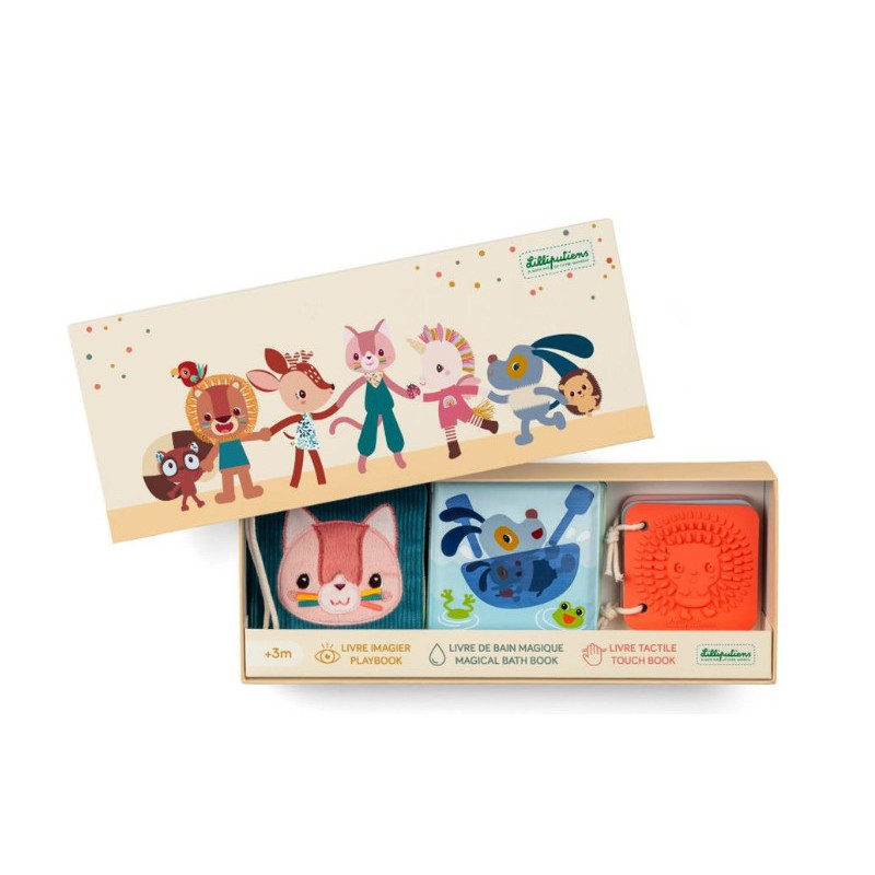 Découvrez le set de 3 livres sensoriels Jardin de Lilliputiens, un coffret comprenant 3 petits livres pour éveiller bébé dès ses premiers mois.