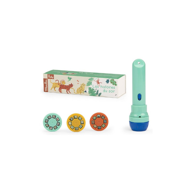 Découvrez la lampe à histoires de la collection La forêt Mawa de Moulin Roty, une lampe torche qui projette des images en couleurs pour raconter de jolies histoires à votre enfant. Bienvenue dans l'univers des animaux de la forêt Mawa !