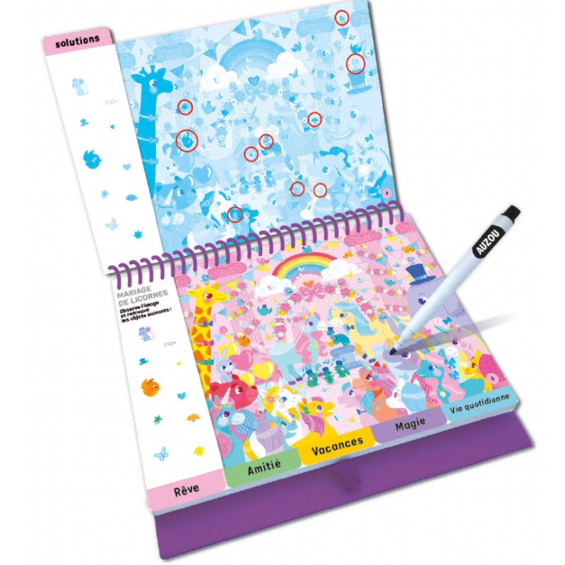 Voici le Cherche et trouve Licornes de Auzou avec 5 thématiques féériques autour de l'univers des licornes : le rêve, l'amitié, les vacances, la magie et la vie quotidienne.