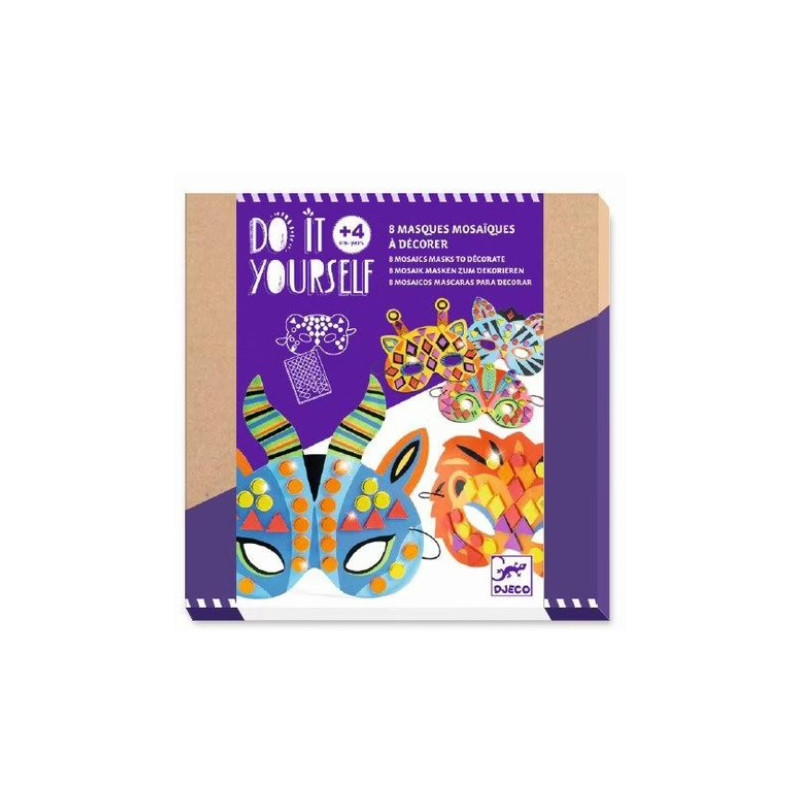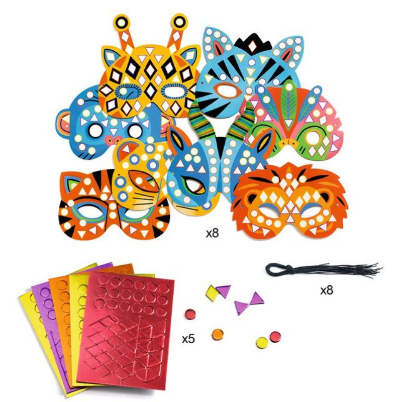 Découvrez les masques mosaïques à décorer de la collection Do It Yourself de Djeco, un coffret créatif pour les enfants à partir de 4 ans avec 8 masques d'animaux de la jungle à décorer avec de la mosaïque qui brille.