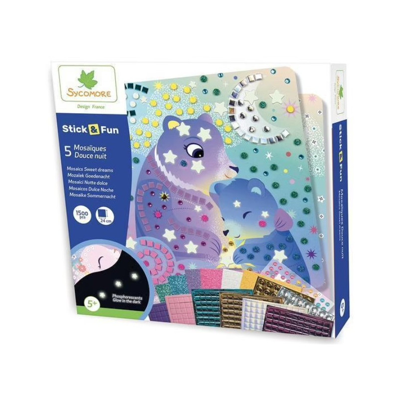 Ce kit de mini mosaïques de Sycomore permet de réaliser 5 magnifiques tableaux sur l'univers câlins de Douces Nuits. Une activité manuelle et créative, simple à réaliser, grâce à des pièces en mousse à coller sur le graphisme correspondant.