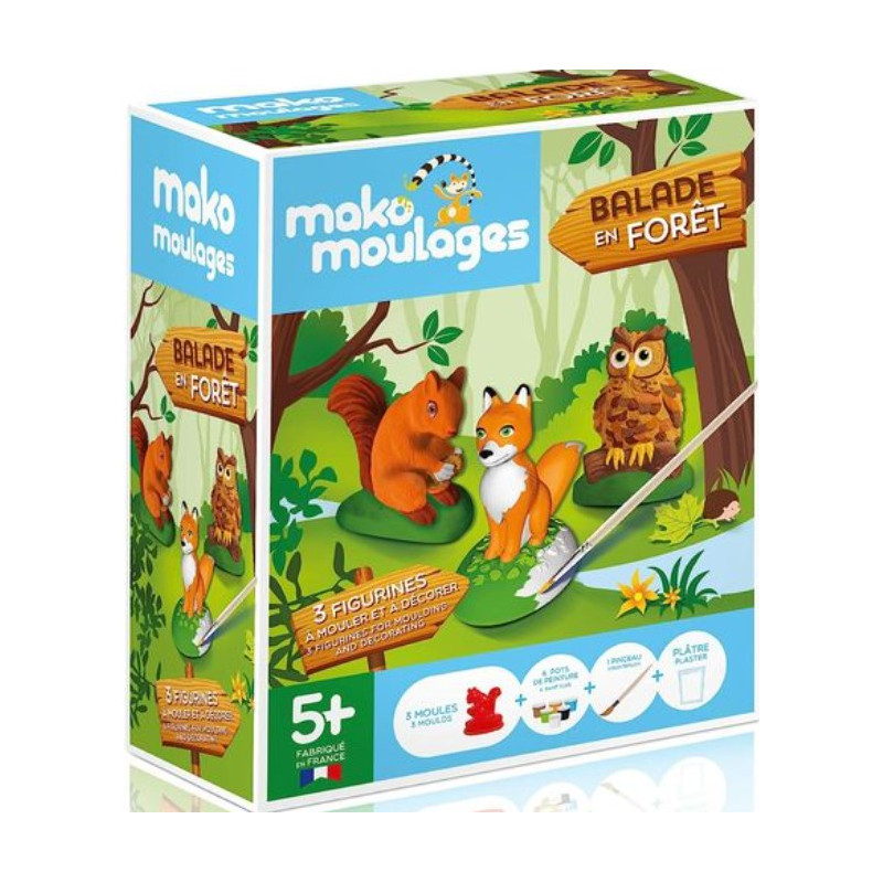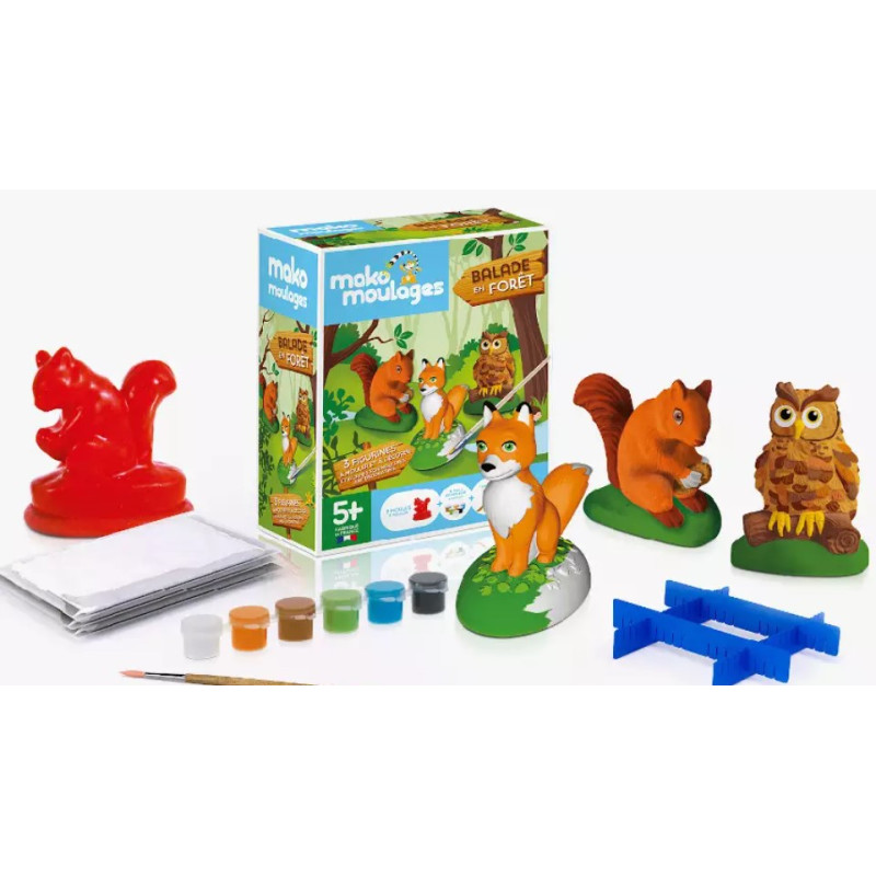 Le coffret créatif contient 3 moules en latex (écureuil, hibou et renard), 3 sachets de 80g de plâtre, 6 pots de peinture 5 ml (marron, orange, bleu, vert, noir, blanc), 4 croisillons, 1 pinceau et une notice d'utilisation.