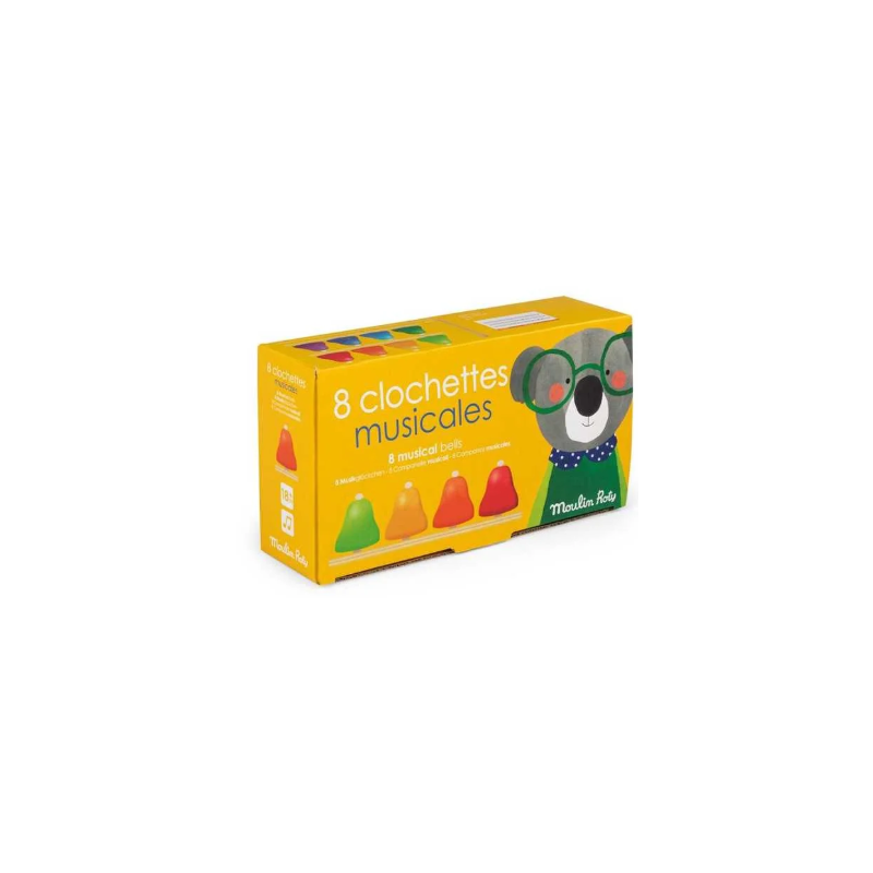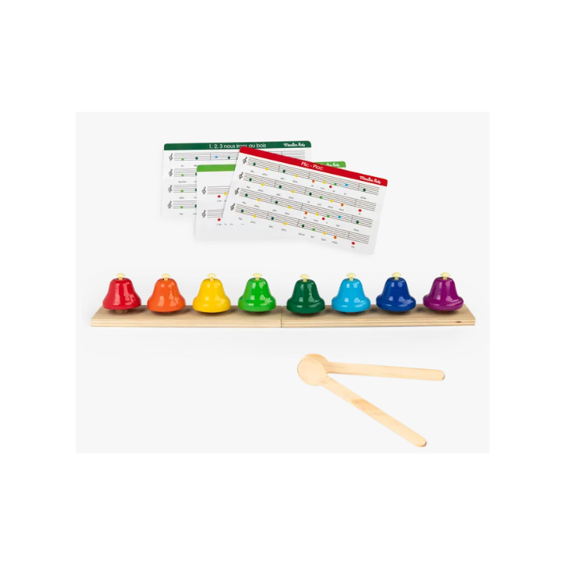 Découvrez le coffret de 8 clochettes musicales Les popipop de Moulin Roty, un magnifique instrument de musique très coloré pour les enfants dès 18 mois avec des baguettes et des partitions.
