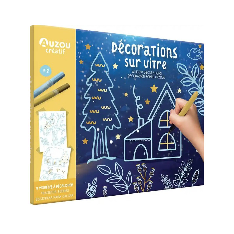Dans ce coffret Décorations sur vitre de Auzou, les enfants découvrent deux super feutres pour vitre: un doré et un bleu clair. Ils y retrouveront aussi 6 modèles et 2 frises à coller à l'arrière de la fenêtre et à décalquer, magnifiquement illustrés par Mel Armstrong.