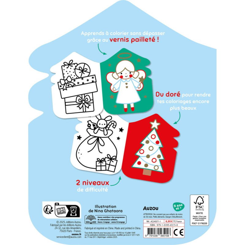 Voici le livre Je colorie sans dépasser Noël de Auzo : découvre tes nouveaux coloriages doré sur le thème de Noël avec deux niveaux de difficulté : le premier niveau pour apprendre à bien colorier sans dépasser avec l'aide du vernis à paillettes et le deuxième niveau sans vernis à paillettes pour montrer tes talents