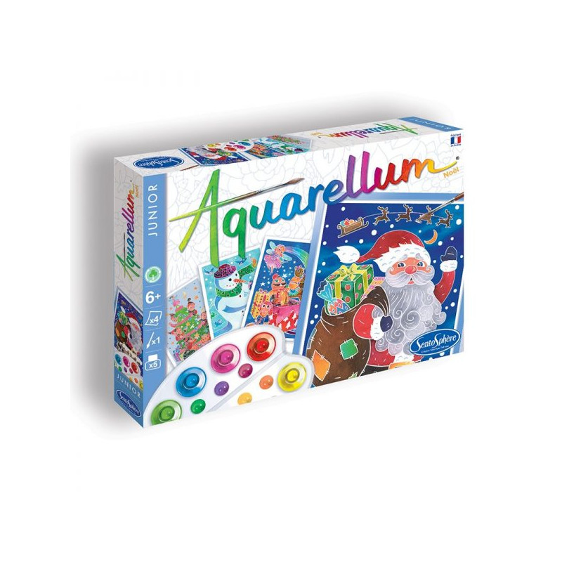 Amusez-vous à peindre le père noël et ses lutins, des cadeaux à retrouver sous le sapin et un joli bonhomme avec ce coffret Aquarellum Junior sur le thème de Noël !
