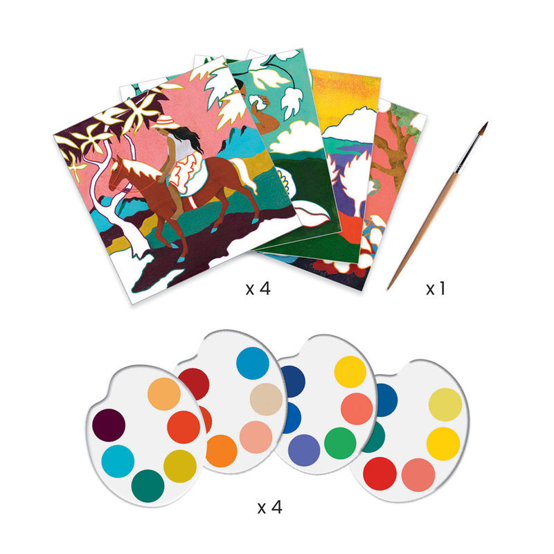 La pochette contient 4 cartes de papier aquarelle illustrées (20 x 20 cm), 4 palettes de peinture en carte épaisse, 1 pinceau, 1 livret explicatif pas à pas en couleurs.