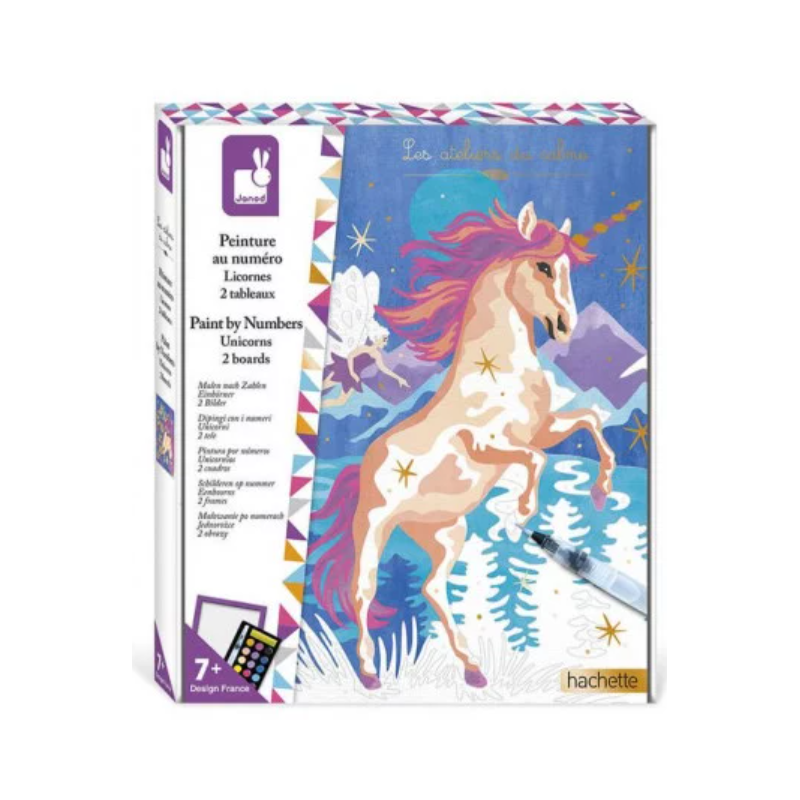 Découvrez le coffret peinture au numéro licornes de la collection Les ateliers du calme de Janod, une activité créative pour les enfants dès 7 ans, permettant de réaliser deux tableaux lumineux avec la célèbre créature légendaire.