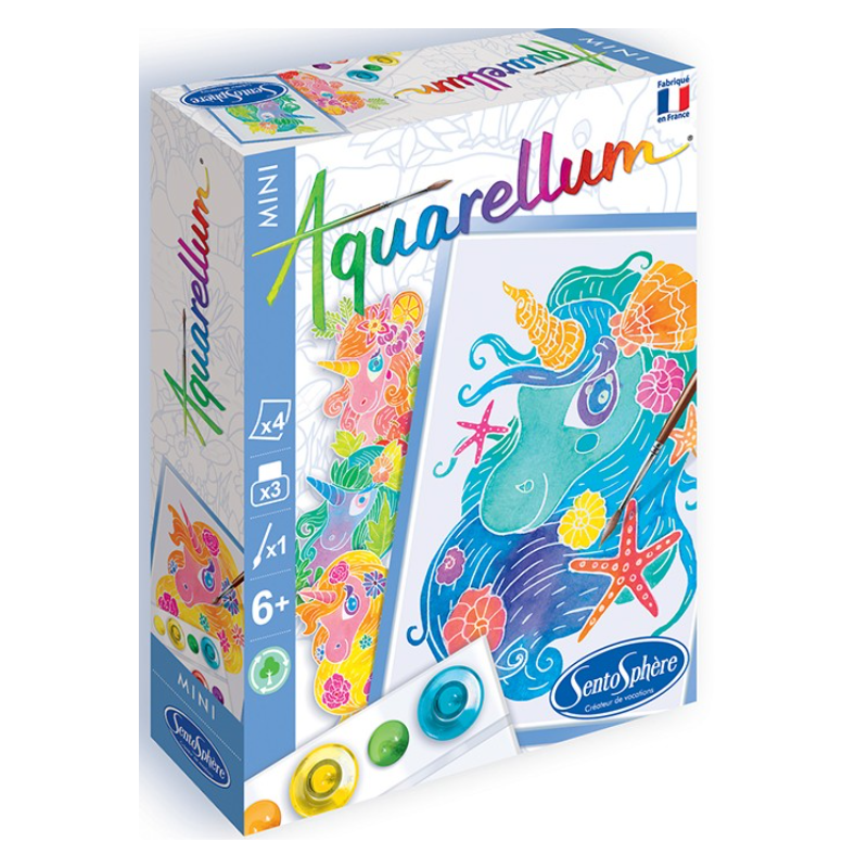 Grâce à ce mini coffret créatif Aquarellum mini Licornes de Sentosphère, découvrez l'art de la peinture aquarelle en réhaussant de couleurs, sans pouvoir dépasser, ces quatre minis tableaux de licornes.