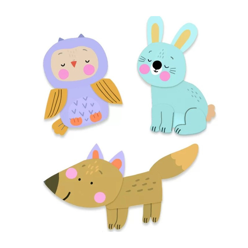 Ce coffret propose une première expérience de peinture où l'adulte prépare les formes détachables en appliquant de la peinture, puis invite l'enfant à plonger ses mains dans la peinture et à badigeonner les formes, un moment de patouille réjouissant pour les tout-petits! L'enfant peut ensuite assembler les formes et ajouter des autocollants, créant ainsi quatre animaux en 2D : un ours, un lapin, un renard et un hibou.