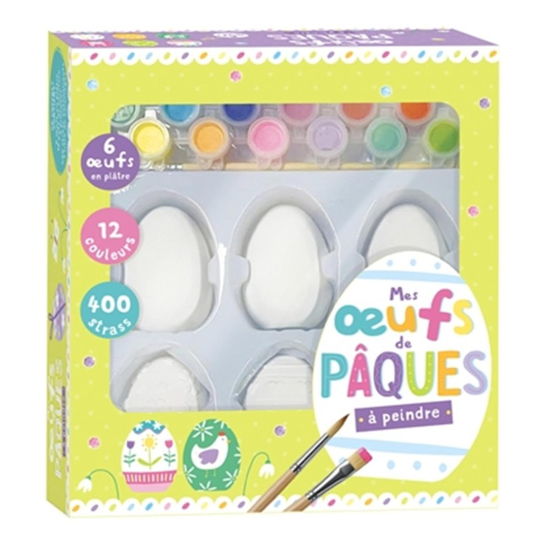 Voici le coffret Mes oeufs de Pâques à peindre de 1 2 3 Soleil qui comprend tout le nécessaire pour décorer 6 œufs en plâtre: 12 pots de peinture, 2 pinceaux, 400 strass et un cahier de coloriages.