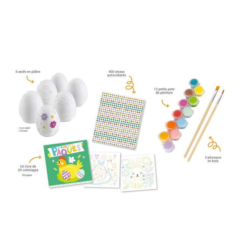 Dans ce coffret, les jeunes enfants - et les plus grands - vont trouver 6 œufs en plâtre, 12 pots de peinture, 2 pinceaux en bois (un plat et un fin), un cahier de coloriages et plus de 400 strass autocollants pour réaliser de superbes décorations de Pâques. La base des œufs est plate afin de pouvoir les poser. Une chouette activité créative à partager en famille !