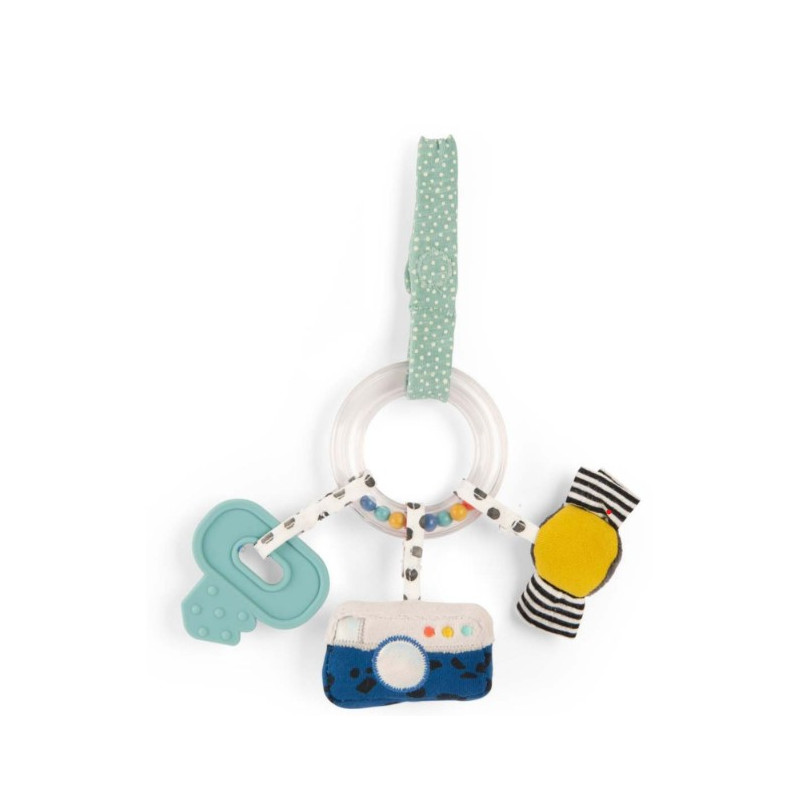Anneau d'activités à manipuler ou à suspendre. Il est composé de plusieurs amulettes aux matières et sons différents et d'un grand anneau de dentition texturé que les petits pourront mâchouiller…