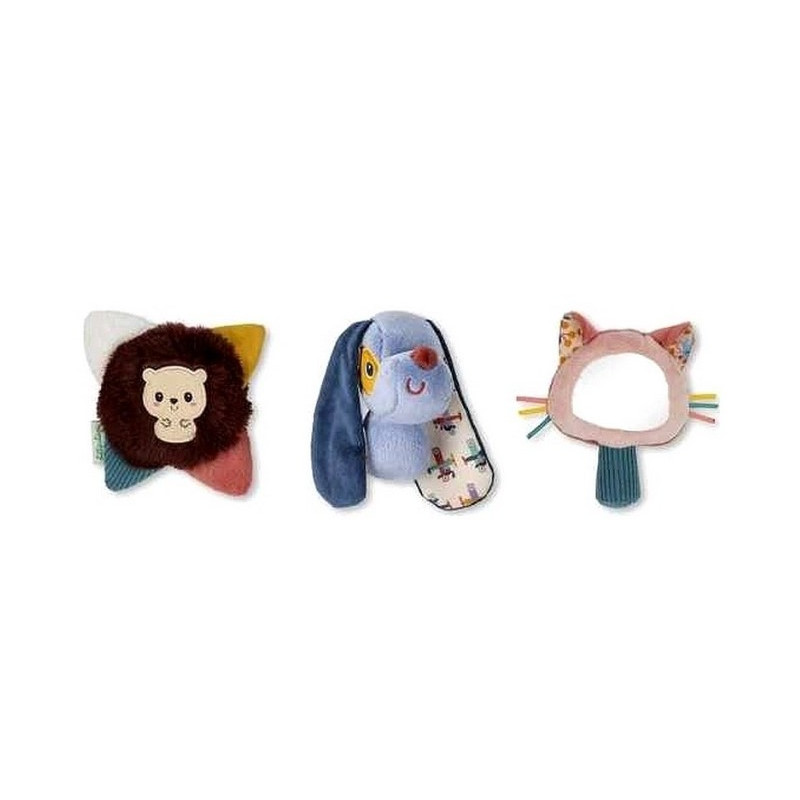 Eveillez les sens de votre bébé avec ce set de hochets sensoriels composé de trois adorables personnages. Jules le chien avec ses longues oreilles crépitantes, stimule l'ouïe grâce à un bruit de papier amusant, Jeanne le chat avec son miroir intégré encourage la découverte de la vue et Léon le hérisson doté de motifs brodés et de matières diverses offre une expérience tactile unique pour développer le sens du toucher.