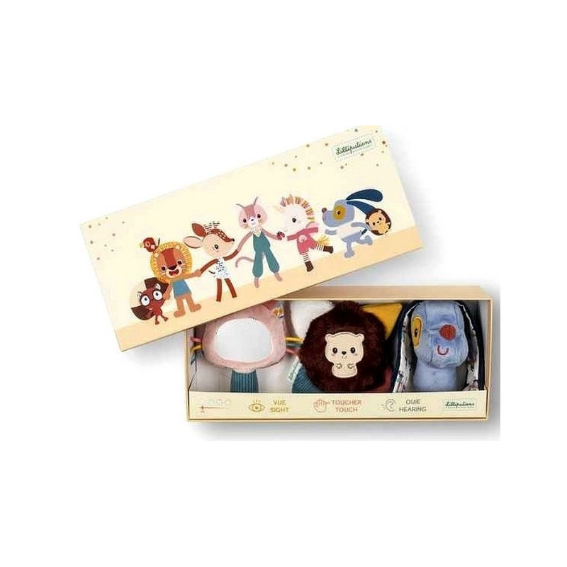 Découvrez le set de découvertes sensorielles Jules le chien de Lilliputiens, un formidable coffret de 3 jouets d'éveil à offrir en cadeau de naissance.