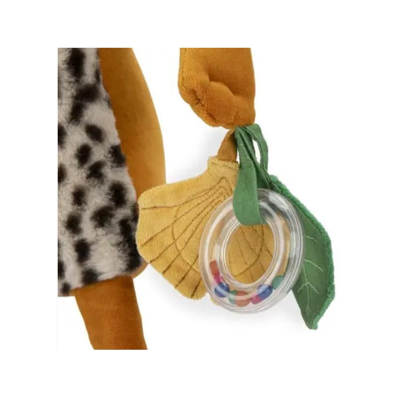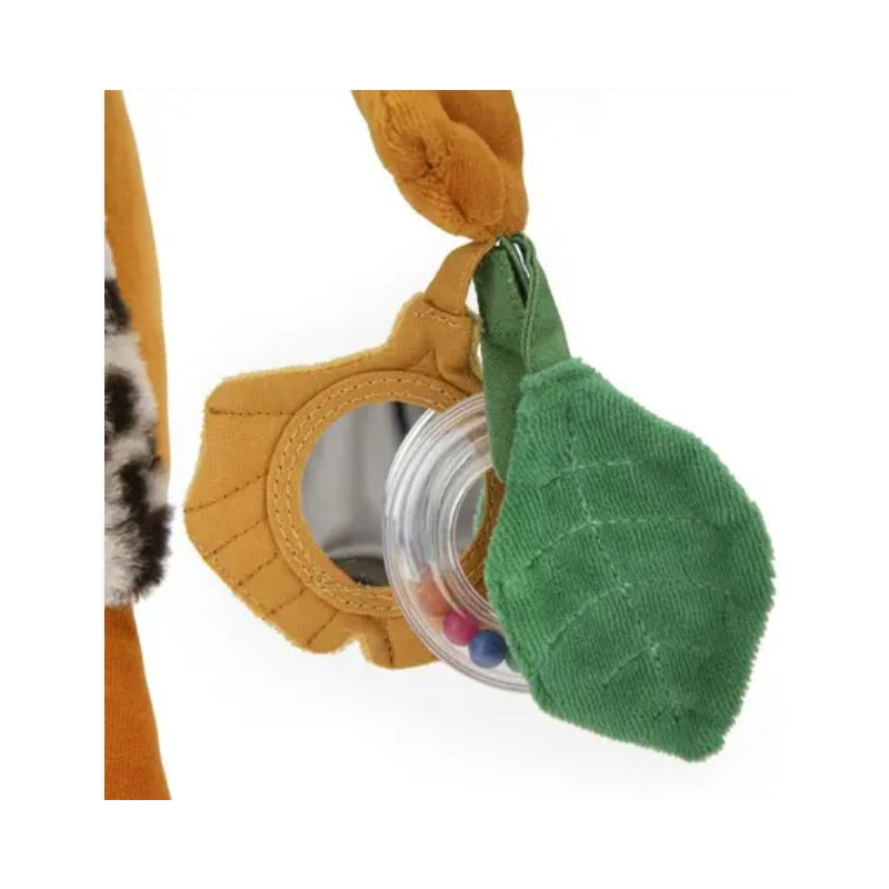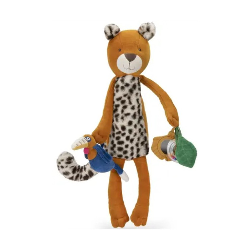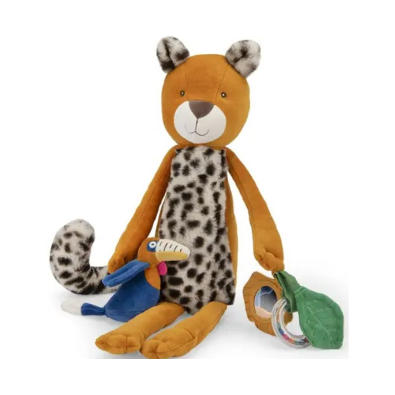 Mais qui voilà ? C'est Taïgo le léopard espiègle de Moulin Roty prêt à jouer à de nombreuses activités ! Anneau à billes colorées, grelots, feuille qui fait scritch, miroir ou encore Litchi le calao à manipuler. Tout pour découvrir le monde.