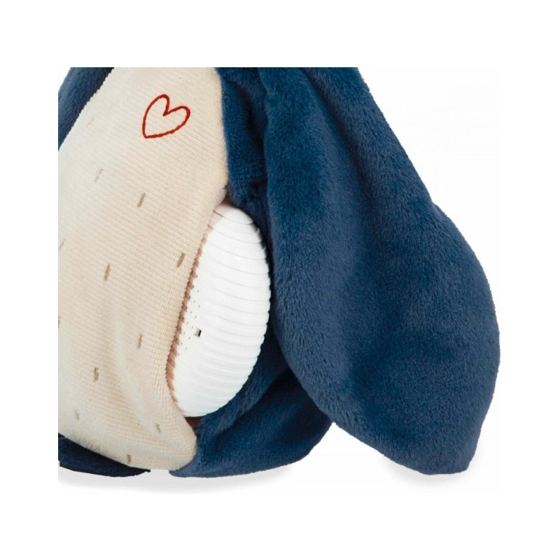 Cette peluche a une poche sur le côté sous l’aile pour glisser le boîtier sonore qui contient un enregistreur vocal pour laisser un message à bébé (90 sec) qui sera joué avant les sons pour l’apaiser et 4 bruits blancs (90sec/sons) avec le vent, la pluie, les battements de coeur et les sons sous la mer. Ce boîtier sonore est muni d'une fonction détecteur de pleur et d'un minuteur 15 min/30min/1h.