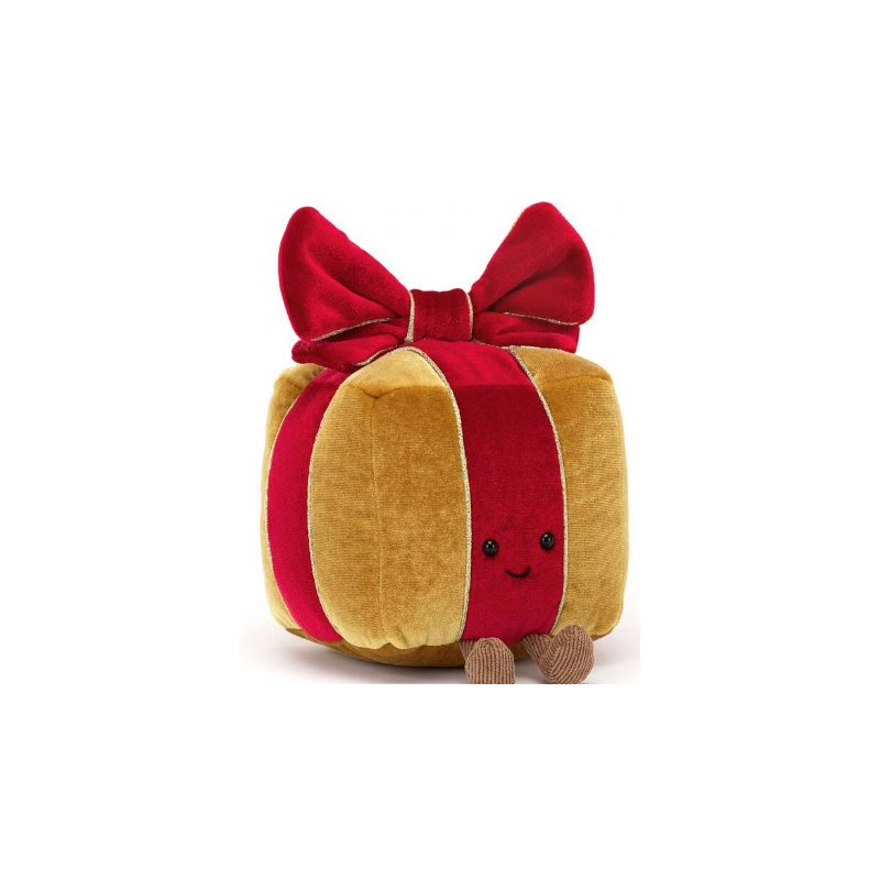 Amuseable Present de Jellycat est une boîte dorée douce avec un ruban de canneberge bordé d'une tresse dorée. Avec un arc froncé gai, un sourire joyeux, une base en daim et des bottes à cordon, ce cadeau est trop mignon!