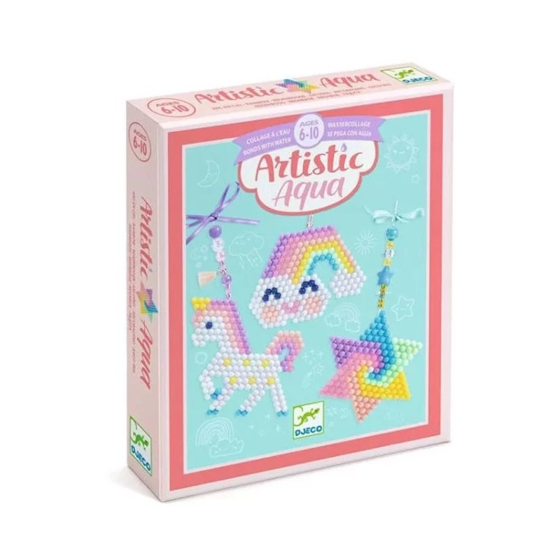 Découvrez le coffret collage à l'eau arc-en-ciel Artistic aqua de Djeco, un coffret créatif pour les enfants de 6 à 10 ans. Un kit pour créer 3 suspensions aux couleurs pastels avec des billes qui se collent à l'eau.