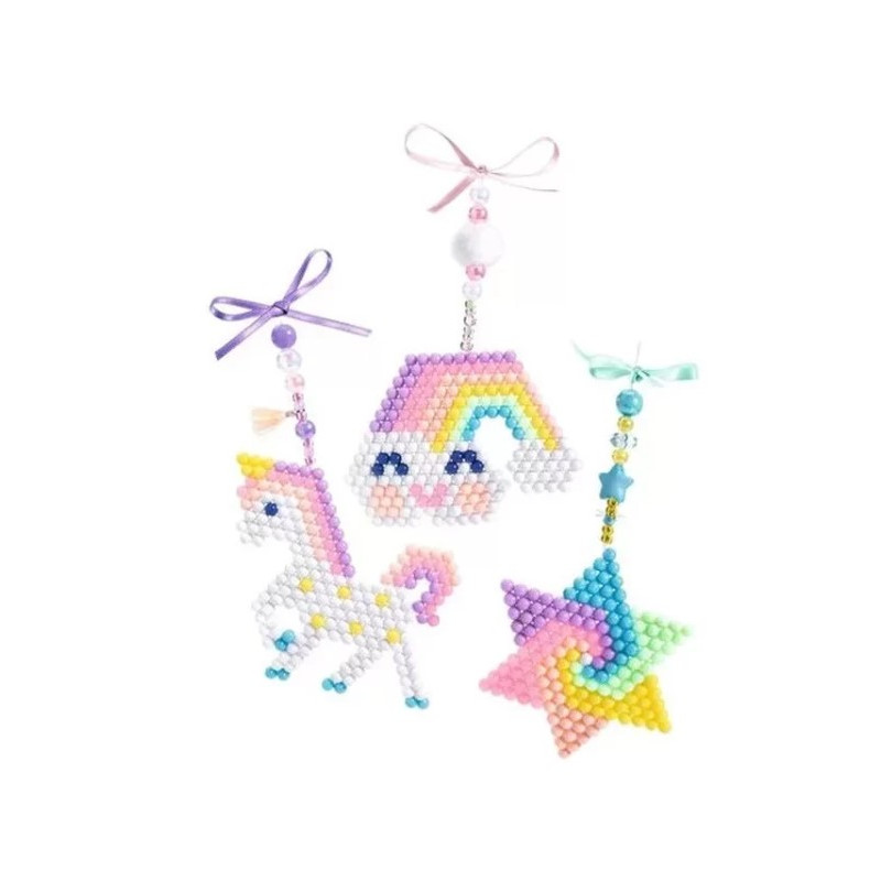 L’enfant place le modèle sous la plaque alvéolée transparente. Il positionne les billes colorées pour reproduire le modèle proposé, puis vaporise de l’eau sur sa réalisation. Une fois sèches, les billes restent collées les unes aux autres comme par magie. Il assemble ensuite perles, ruban et breloques pour transformer ses créations en jolies suspensions.