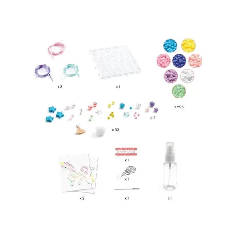 Le coffret contient 1 plaque support de travail, 1 vaporisateur, 1 assortiment de billes plastique qui se collent à l’eau (8 couleurs), perles et breloques, fil élastique transparent, rubans, 1 aiguille, 1 passe-fil, 1 livret d’explications pas à pas en couleurs.