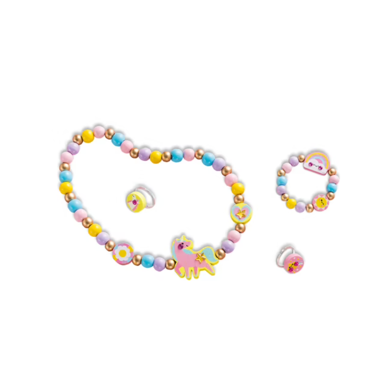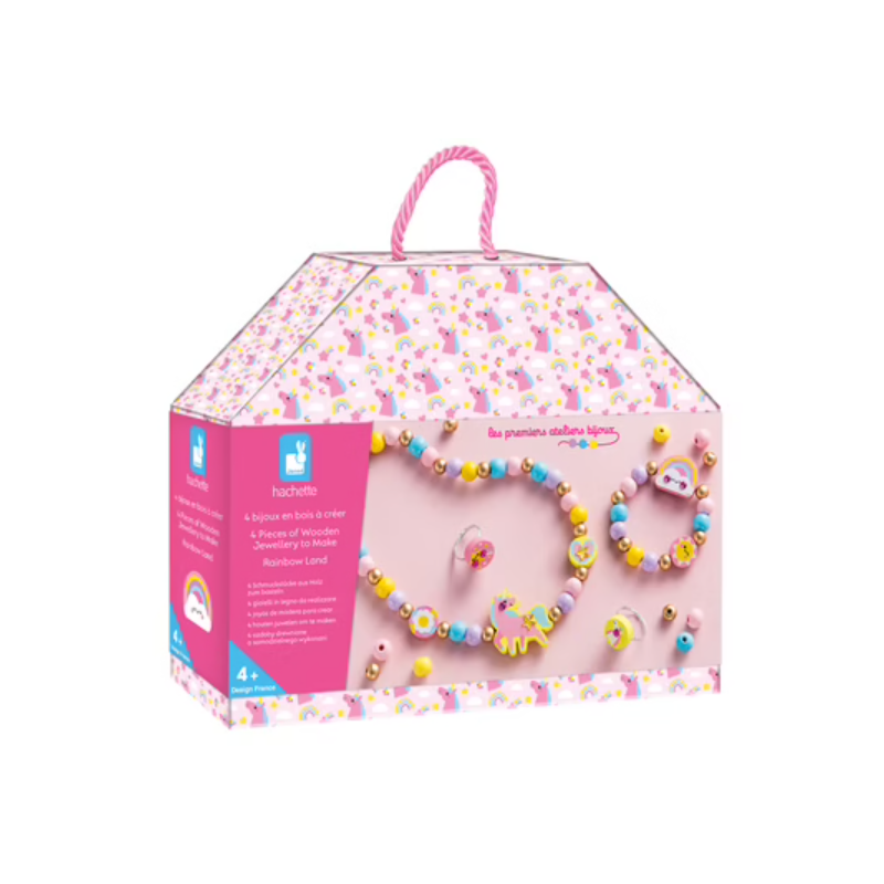 Découvrez le coffret 4 bijoux en bois à créer Pays arc-en-ciel de Janod , un coffret créatif sur le thème de la licorne et de l'arc-en-ciel permettant aux enfants pour confectionner leurs propres bijoux facilement, à l'aide de perles colorées.