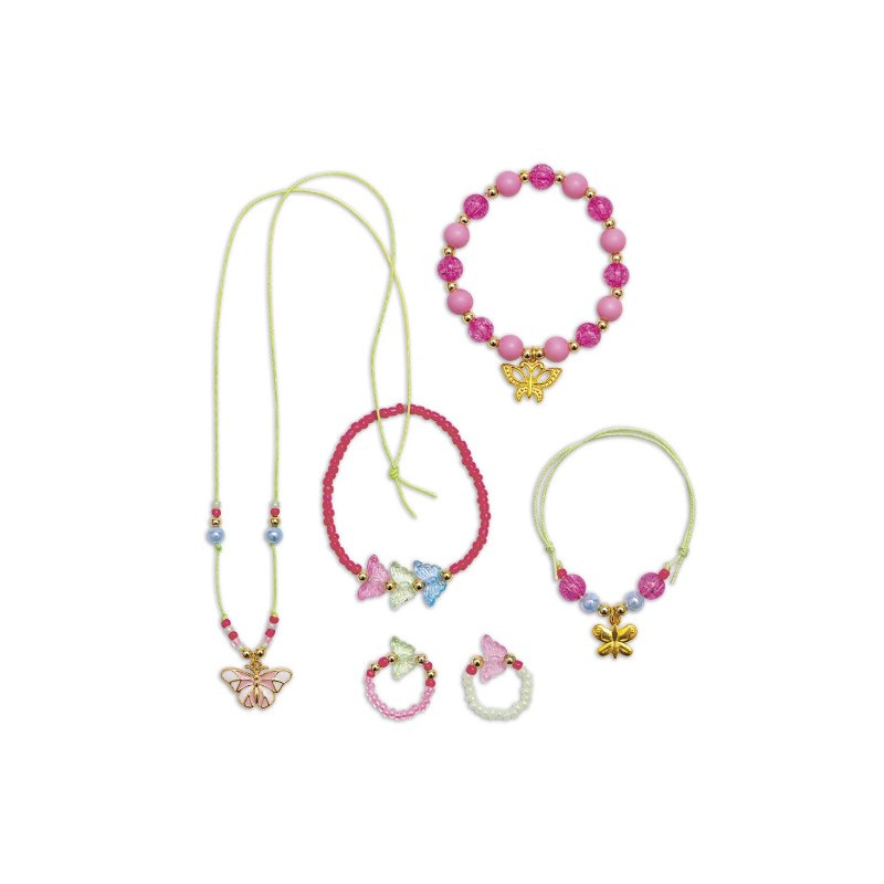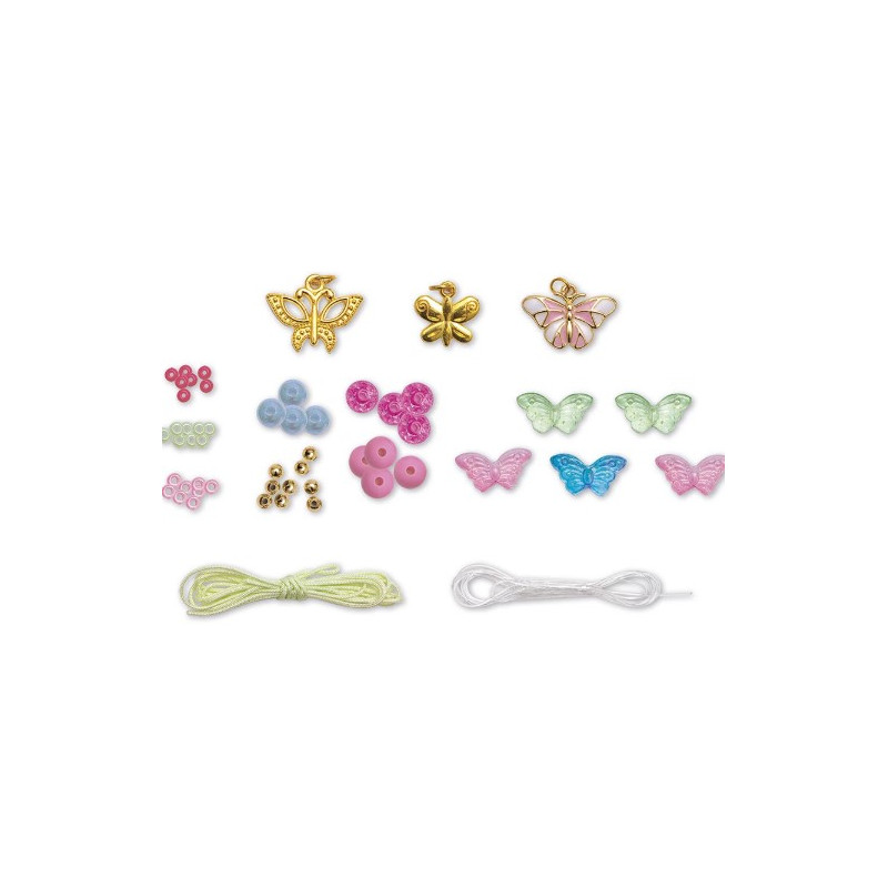 Ce coffret de loisirs créatifs comprend 5 perles papillons, 3 breloques papillons, 32 perles dorées, 9 perles fuchsia, 8 perles roses mat, 140 perles de rocaille, 4 perles bleues, du fil vert et du fil élastique.