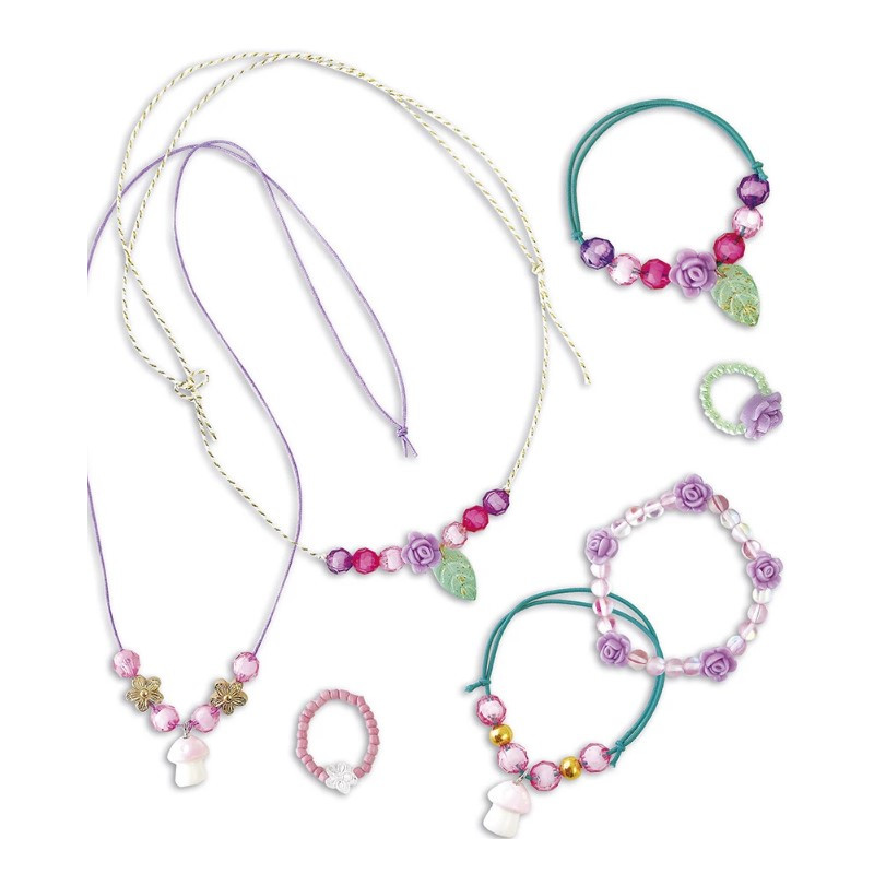 Ce coffret de loisirs créatifs comprend 2 breloques champignons, 8 perles en forme de rose, 1 perle fleur transparente, 1 perle fleur dorée, 2 pendentifs feuilles, 50 perles de rocaille, 2 perles dorées, 20 perles roses transparentes, 20 perles rondes, du fil élastique vert, du fil élastique transparent, du fil violet et du fil tressé.