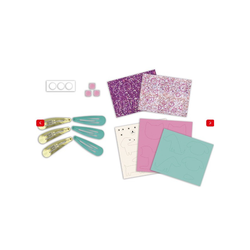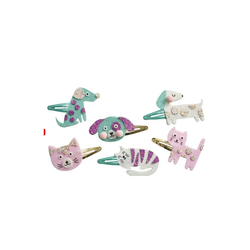 Le coffret comprend tout le matériel nécessaire pour réaliser de superbes barrettes sur le thème des chiens et des chats, à l'aide de feutrine, de matière pailletée autocollante et de pompons.
