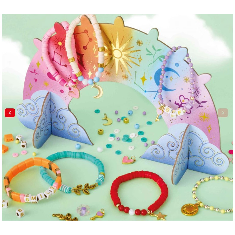 Ce coffret ludique contient tout le nécessaire pour réaliser 7 bracelets : des perles Heishi, des perles de rocaille, des breloques en forme de lune, d'étoile, de soleil, de feuille, de clef... Chaque bracelet est associé à une couleur dominante et une énergie particulière. Une fois les créations terminées, votre enfant pourra les déposer sur un superbe arc-en-ciel à bijoux inclus.