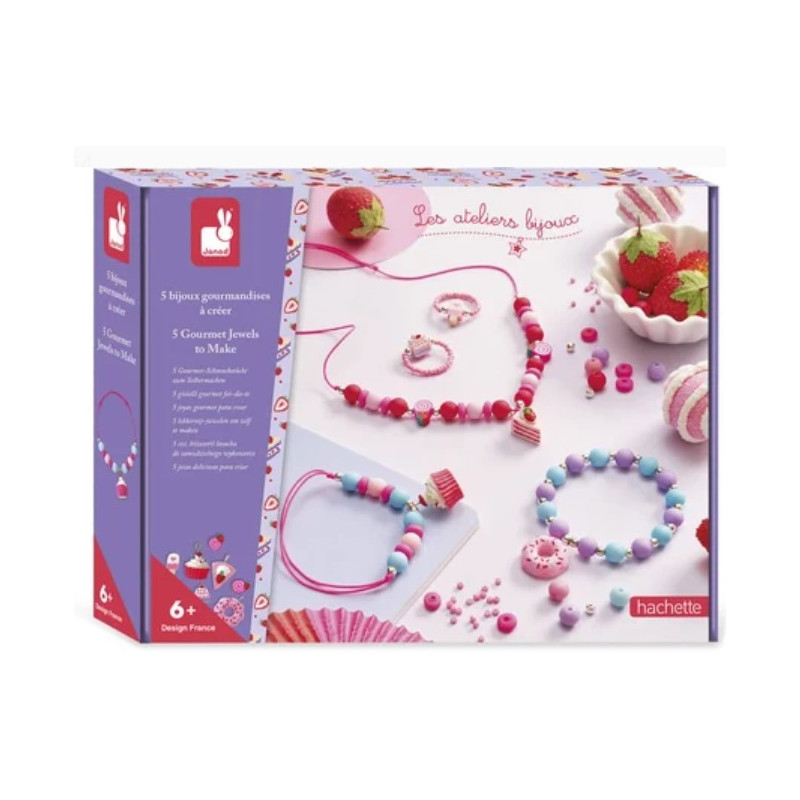 Découvrez le coffret 5 bijoux gourmandises à créer de la collection Les Ateliers Bijoux de Janod, un coffret créatif permettant aux enfants, dès 6 ans, de confectionner des bijoux uniques sur le thème des sucreries, grâce à des perles colorées et des breloques gourmandes.