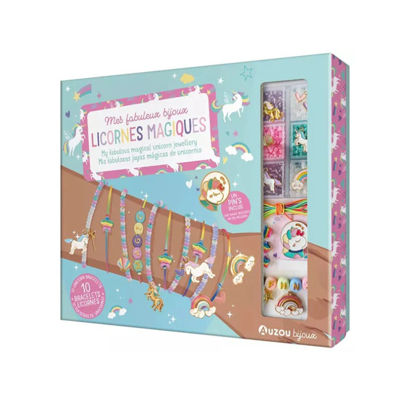 Découvrez Mes fabuleux bijoux licornes magiques de la collection "Auzou Bijoux" de Auzou, un magnifique coffret permettant aux enfants, dès 6 ans, de confectionner 8 bracelets sur le thème des licornes.