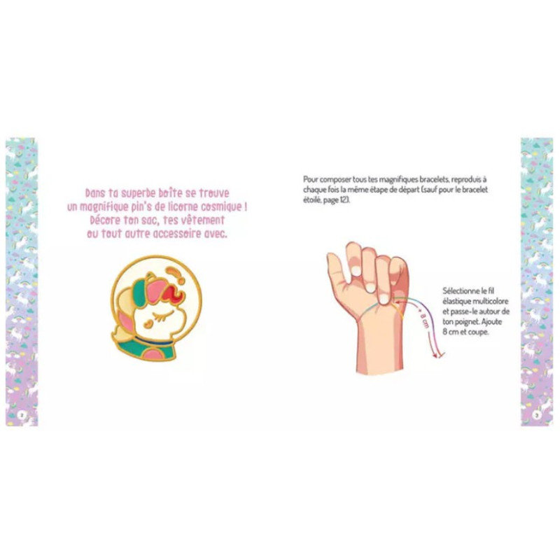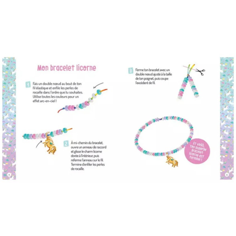 Ce coffret contient tout le nécessaire pour réaliser des bracelets colorées avec des accessoires licornes : du fil aux couleurs de l'arc-en-ciel, des perles "Lettre", des perles colorées et des charms.