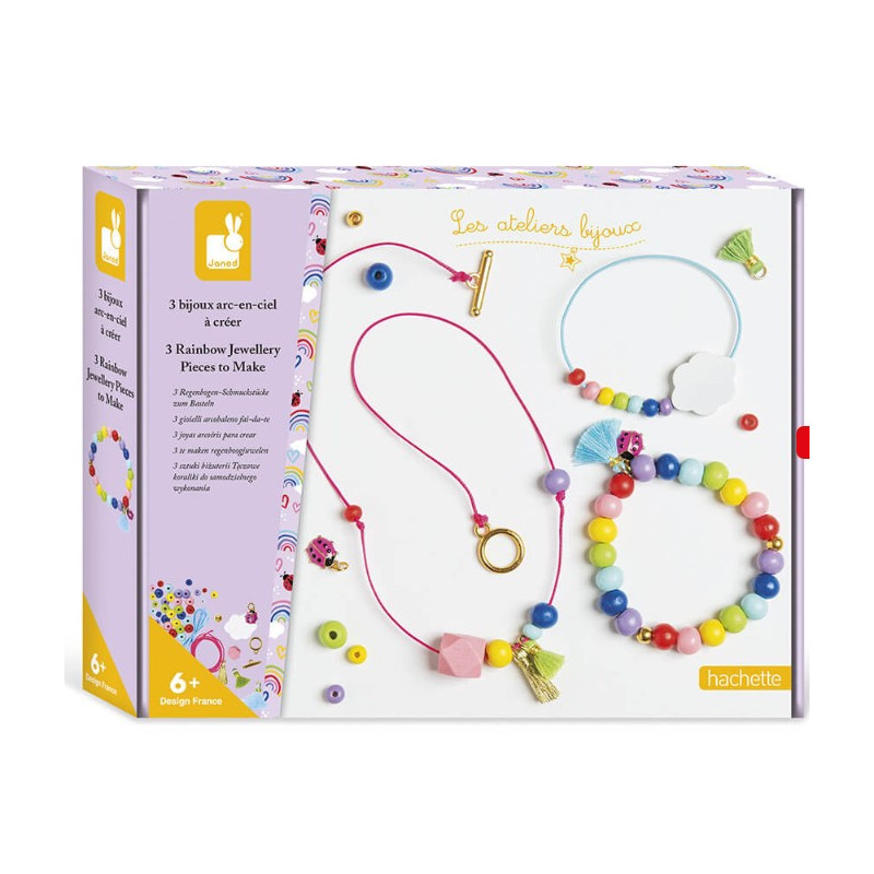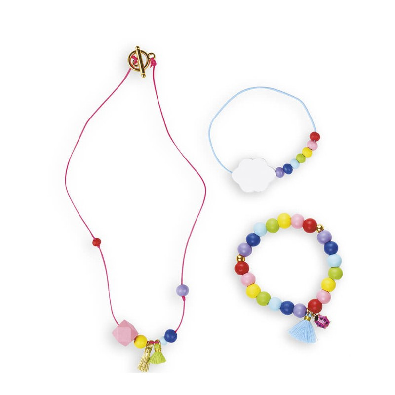 Créé ta propre parure de bijoux grâce! au kit créatif Bijoux Arc en ciel de Janod : il permet de réaliser 2 bracelets et 1 collier en perles de bois aux belles couleurs vives. Un livret détaillé en photos aidera les enfants à réaliser chaque étape.