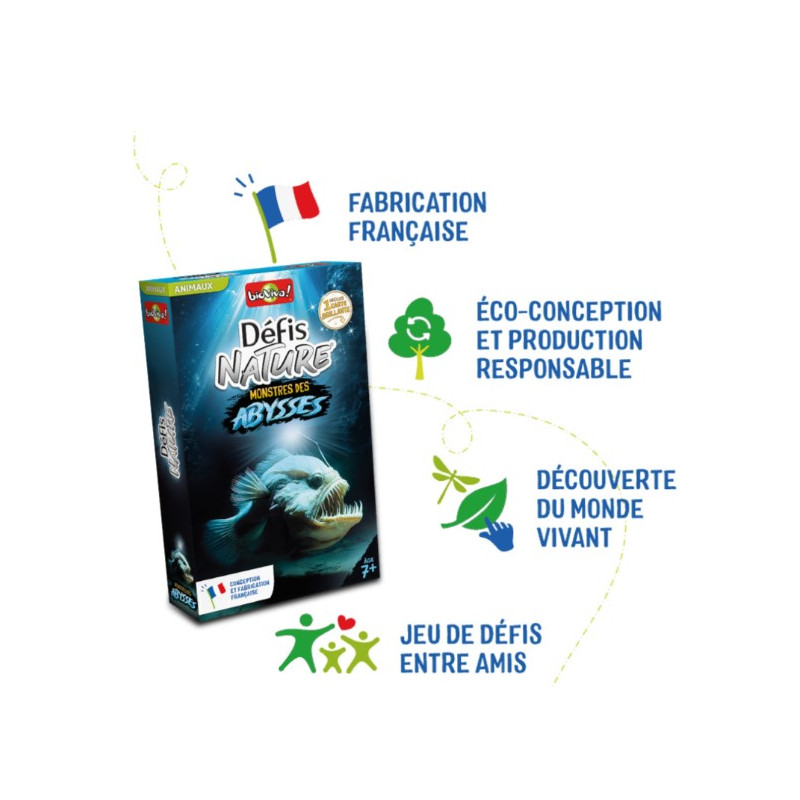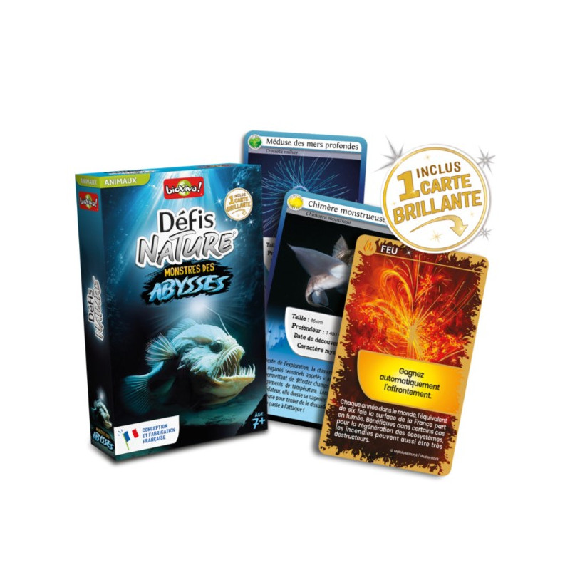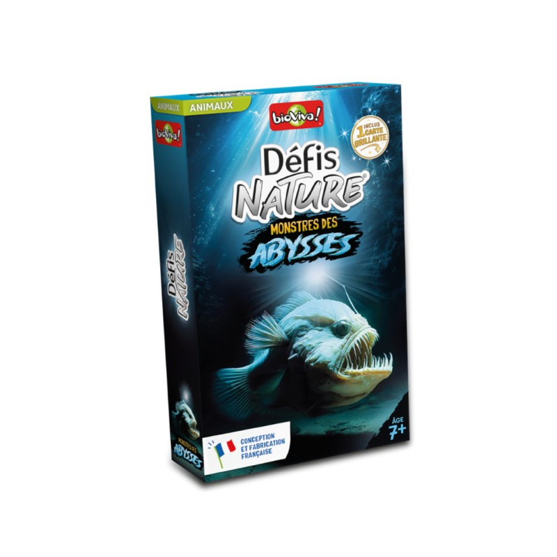 Défis Nature - Monstres des abysses de Bioviva vous emmène à la rencontre des monstres des profondeurs sous-marines ! Découvrez leurs facultés exceptionnelles, puis pariez sur leurs points forts pour collecter toutes les cartes du jeu et remporter la partie. Alors, prêts à relever le défi ?
