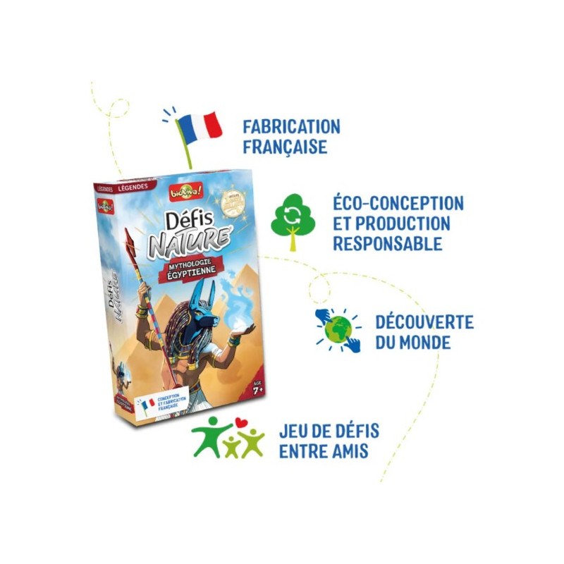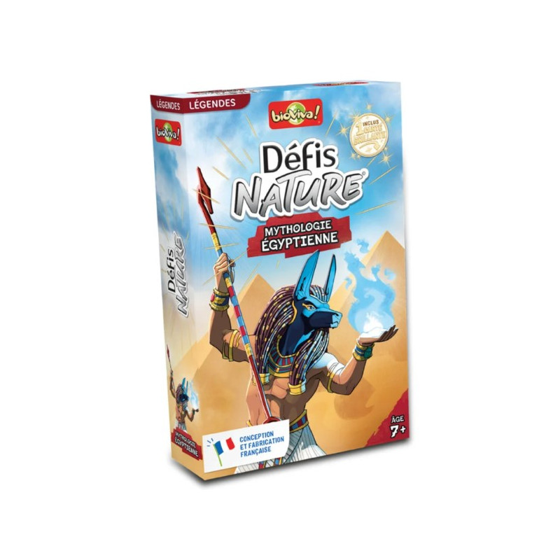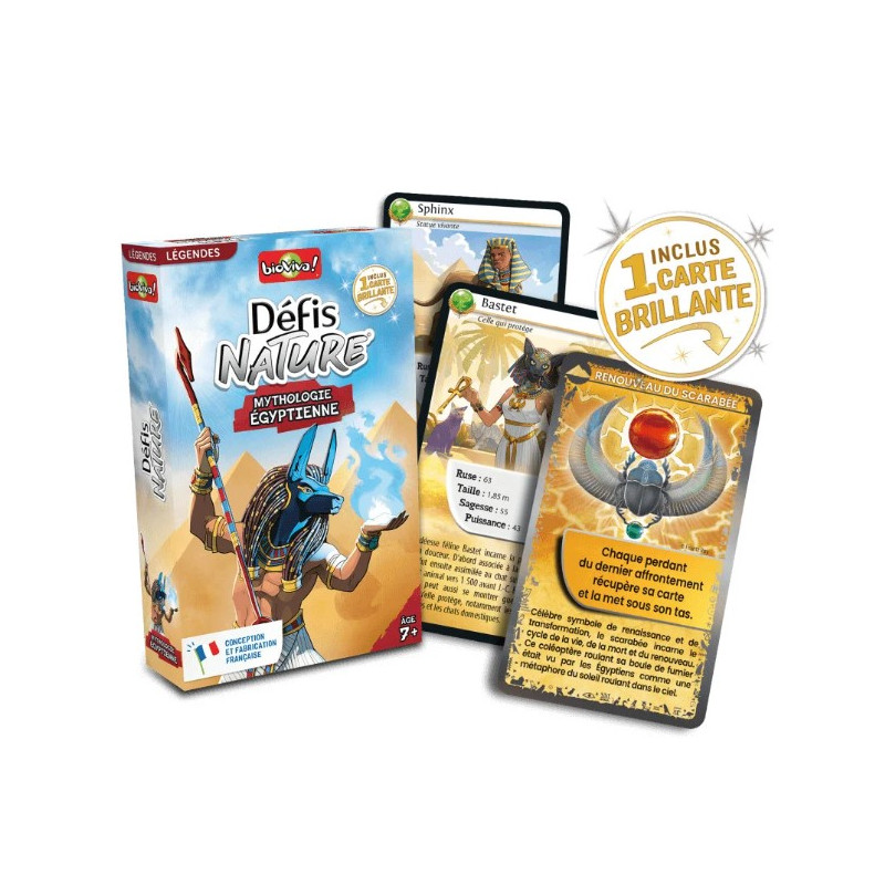 Défis Nature - Mythologie égyptienne de Bioviva vous emmène à la rencontre des personnages emblématiques de la mythologie égyptienne ! Découvrez leurs facultés exceptionnelles, puis pariez sur leurs points forts pour collecter toutes les cartes du jeu et remporter la partie.