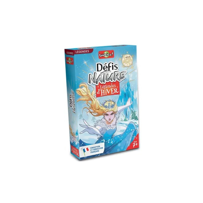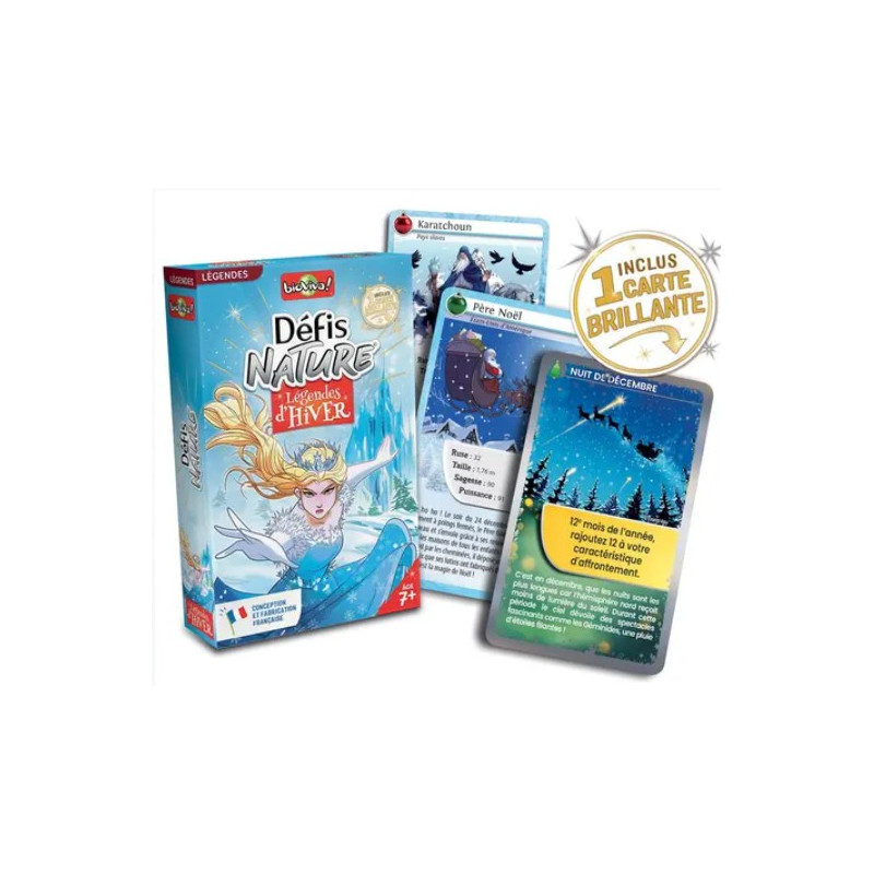 Voici le jeu Défis nature Légendes d'Hiver de Bioviva. Découvrez les personnages et créatures légendaires qui peuplent notre imaginaire lors des longues nuits d’hiver. Au travers de cartes superbement illustrées, pariez sur leurs points forts pour gagner la bataille ! Caractéristiques : Taille – Puissance – Sagesse – Ruse Pastille : Date d’apparition.