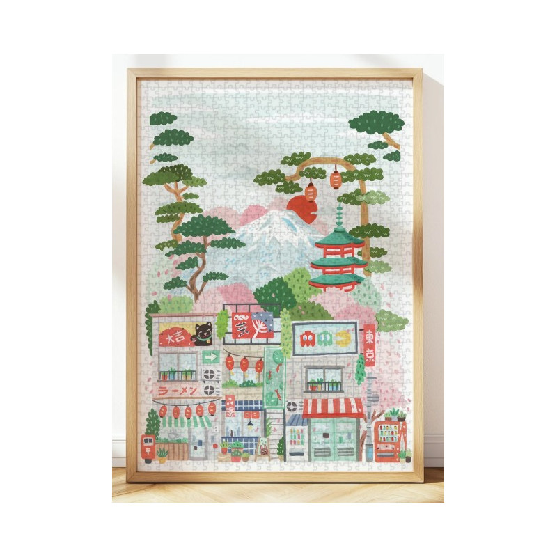 Ici, elle a donc illustré la ville de Tokyo dans toute sa splendeur. On y retrouve des magasins et des restaurants et les panneaux lumineux qui caractérisent la ville, mais également le Mont Fuji dans le fond, un temple japonais et les cerisiers en fleurs. Plongez-vous dans toute la palette de couleurs que compose ce puzzle !